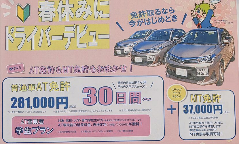 今回のタイトルは「春休みにドライバーデビュー」「免許取るなら今がはじめどき」です。