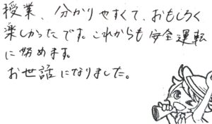 授業、分かりやすくておもしろく楽しかったです。 これからも安全運転に努めます。 お世話になりました。